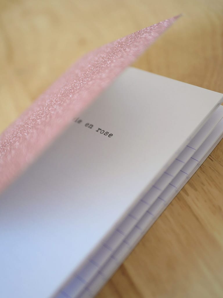 Les enfants et les carnets, ça marche à tous les coups. Ils y dessinent, ils y écrivent leurs secrets,… Alors quand le carnet est joli, qu’il a des paillettes et qu’on peut personnaliser la page de garde avec un petit texte, c’est le graal ! Pour Alice, j’ai évidemment choisi le rose à paillettes ! (jamais de rose pour ma fille j’avais dit bien sûr).